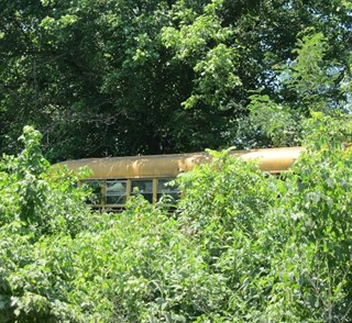 A few houses are scattered down the small grid of streets among the trees, some disappearing into the underbrush, like this retired school bus hiding in the bushes.