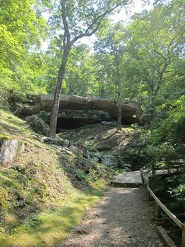 While this mulling was going on, somewhere a little north of Clinton, we spotted signs for the Natural Bridge, which led us down a precipitous drop to a parking area near apparently abandoned cabins. Realizing this was a pedestrian-only location, late in the afternoon (having wasted a majority of our day eating Mexican food, watching local wheelchair drivers and purchasing bikes), we opted for hiking instead of biking. Physical activity feels mandatory when on vacation in the hills of Arkansas, but it requires bottles of bug spray, gallons of sunscreen and mental toughness to endure the jungle heat that will blanket you as soon as you step outside.