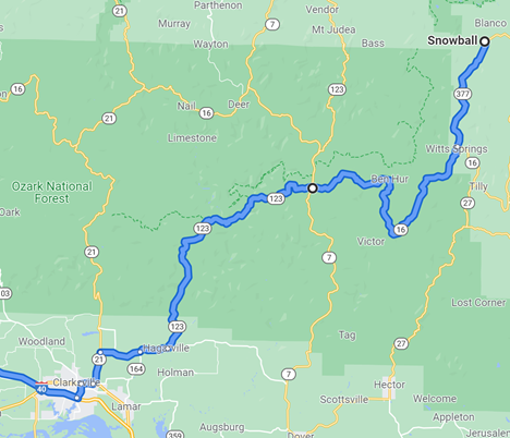 Mountain town names in Arkansas run the gamut from normal and boring (Witts Springs), to historic (Ben Hur), to the questionable. Driving by the town sign for Dongola, I heard Elf when he meets Francisco. “Dongola! That’s a fun name.” Big smile.