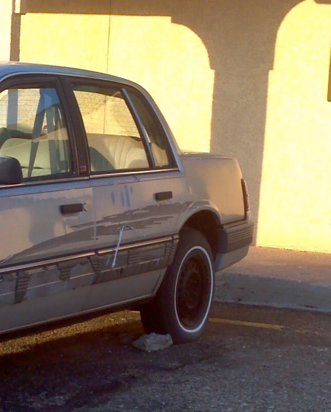 Getting in the car, we took a look at the vehicle occupying the space next to ours. Looks like this might have been here a while. Maybe a long-term resident.