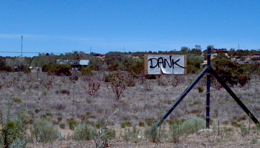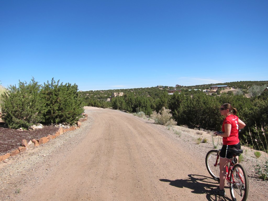 It turned out to be a beautiful day – clear, blue skies and 80 degrees. This was better than a nap anyway, we told ourselves. The ride took us from the north end of Santa Fe into town, where the streets transition from country dirt to town paved. After a short round of work fixing a flat tire, we decided the antidote to the past 24 hours of weirdness was, of course, alcohol. A local Mexican spot down the hill provided food and beverages, after which we got word that the property was ready. We headed back that way, just intoxicated enough to laugh at this vandalized sign, but not too intoxicated to operate our two-wheeled vehicles.