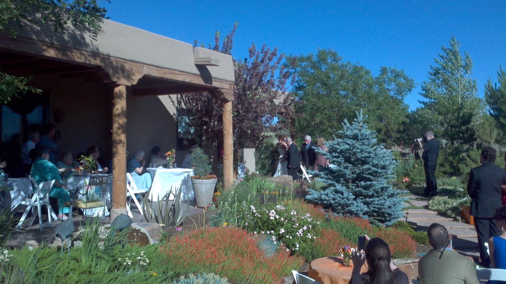 We headed out around the time the sun was going down. Our margaritas had disappeared and we were ready to replace those. So (of course) there was a quick detour to Santa Fe Brewing, where we found the Chicken Killer Stout, another moderately powerful beer, and some conversation with a one-eyed local man. We made sure the beer garden would be open later, and headed off to ceremony, which was being held in someone’s backyard. Summer at elevations like Santa Fe can be pleasant … or it can be toasty. Today was toasty, wtih about 50 people gathering in the yard dressed in uncomfortable clothes, sweating, and waiting for the wine part of the wedding.