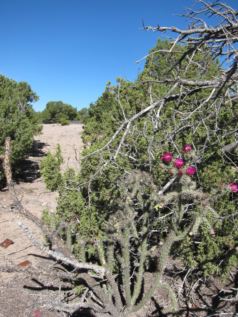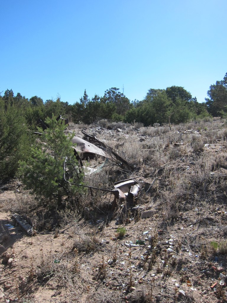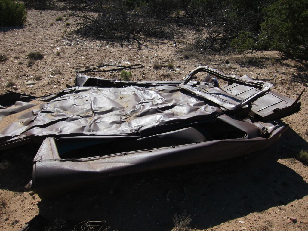 Among the prickly brush and rocky terrain, we saw something shiny. Closer inspection revealed this flattened chunk of metal was formerly a vehicle, which appears to have been disintegrating in the New Mexico desert for many years.