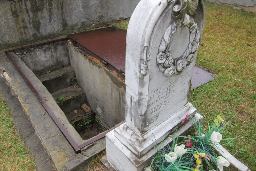 We were especially curious about a grave which included stairs headed down into the soggy earth. A little research turned up a story of a very sad mother who desired to comfort her deceased daughter during inclement weather. She accomplished this by visiting during storms in the stairwell. Creepy.