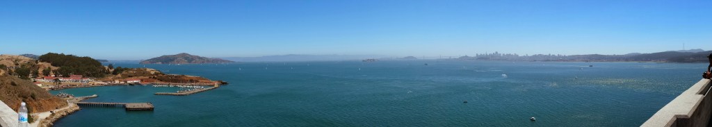 From the north end, the view to the east is pretty impressive – clear weather let us see Alcatraz, Treasure Island, the Oakland Bay Bridge, downtown, and the flotilla of boats cutting through the powerful currents streaming under the bridge into the bay: