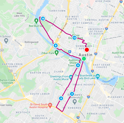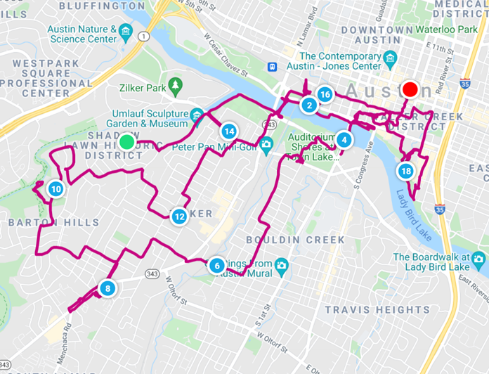 This wasn’t race day, so we were allowed to sleep in. Fighting off hangovers, morning officially started around 11am, when we finally got up and explored the little place we had reserved for our half-marathon adventure. Tucked into a corner on the third floor (how did we get in the night before?) this tiny little studio apartment was stuffed full of every knick-knack available to humans. The owner was obviously a fan of flea markets and garage sales and filling up every corner of her residence. There wasn’t a bare spot on the walls, shelves or counters. Discovering a coffee maker, we brewed and slowly consumed what we desperately hoped would alleviate pounding heads. Today our only mission was to retrieve our race packets. We decided this would be more fun on two wheels instead of four, and we unloaded the bikes from the back of the car. First stop – Austin Java for fancier coffee than we had at the knick-knack closet. The Barton Hills area is a great place to explore via bike – we enjoyed some fresh air, wandering around and up and down the hills and soaking up a beautiful day. It was a challenging ride for two hungover travelers, but as usual, we felt the need to punish ourselves for our poor decisions the previous night.