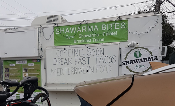 On our way out, we passed the Shawarma Bites food truck. Not available yet, according to their sign. Comeing soon. We’ll check back …