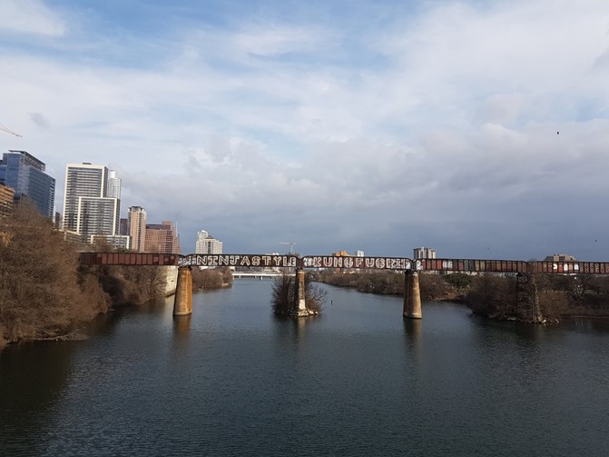 Continuing our exploration, we followed bike trails towards downtown. Crossing one of the many bridges over Lady Bird Lake, we stopped to admire the work of a local graffiti artist. Sadly, this classic phrase has since been partially painted over but in 2018 citizens and residents were able to stand on the bridge and wonder, “what the —- does that mean”?