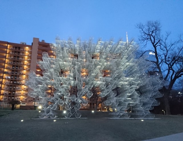 After dinner, we weren’t quite ready to head back to the claustrophobic apartment. There were more trails to ride and more bars to visit. We did both, wandering around Austin, in and out of bars in bike clothes, and stopping when we came across this huge silver sculpture. Evidently someone liked bikes as much as we do, so much that they constructed an entire work of art and called it “Forever Bicycles.” We stopped to admire the 3-D bikes, and wondered how many beers we had actually had. Was that one bike.. or several?