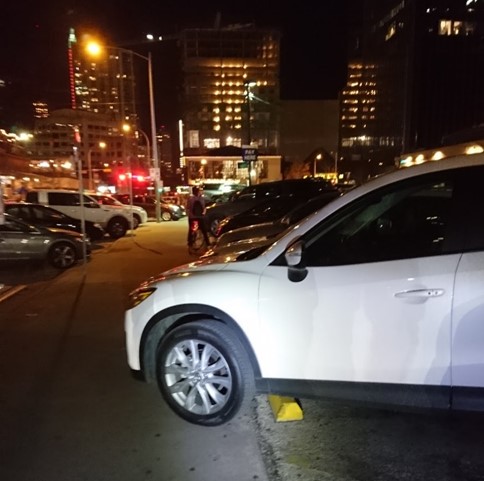 Navigating downtown Austin on a Saturday night on bicycles demonstrates questionable judgement, but we were willing to be questionable. An example of the risks can be seen below – if you’re far enough over the guardrails of beverage consumption to just park your car over the parking stops, you might not have the best ability to dodge other moving objects. We also found bikes are easier to park.