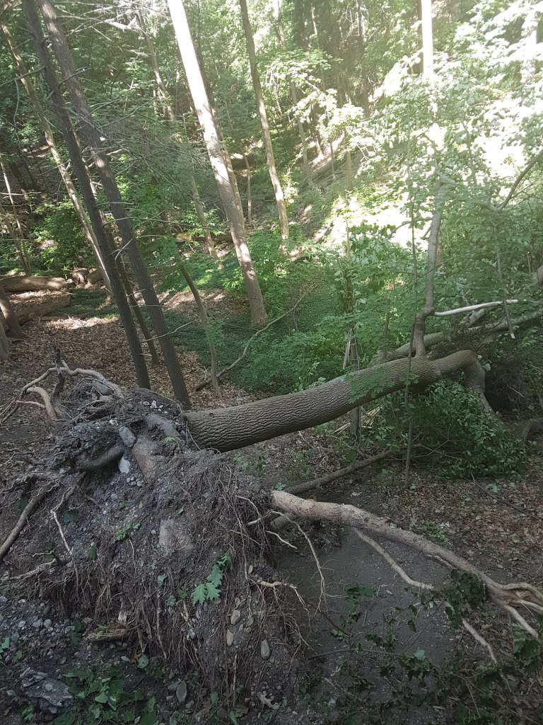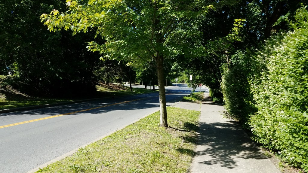 Walking down the winding back streets of Ithaca is a beautiful way to start the day, with the elevation above the glacial lakes and dense forests and creeks combining nicely. Along the way, we saw periodic reminders that steep hills and tall trees are sometimes incompatible …