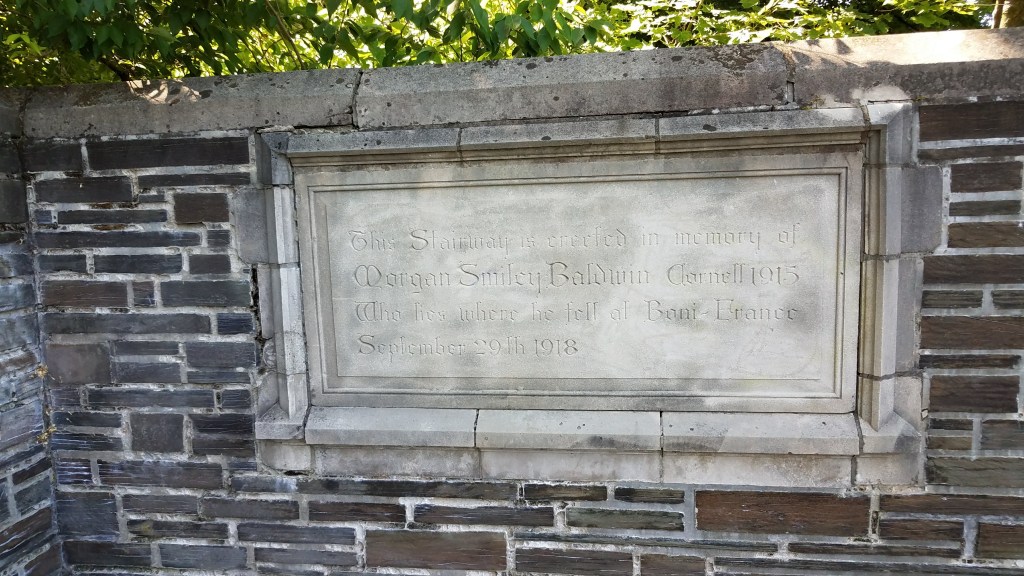 Our route took us by the Morgan Smiley Baldwin Staircase, a memorial stairway constructed in memory of a soldier who was killed in the Battle of the Hindenburg Line, about month before World War I ended. The stairs went up in 1925. Repairs and general maintenance are required on structures in the area, given the terrain, wide temperature ranges between summer and winter, and frequent rains. During a routine repair in 2006, a mason came across what appeared to be a tin box. Administrators at Cornell University unsealed the container and found multiple newspaper articles, yearbooks, and some of Mr. Baldwin’s fraternity items, none of which had seen the light of day since 1925.