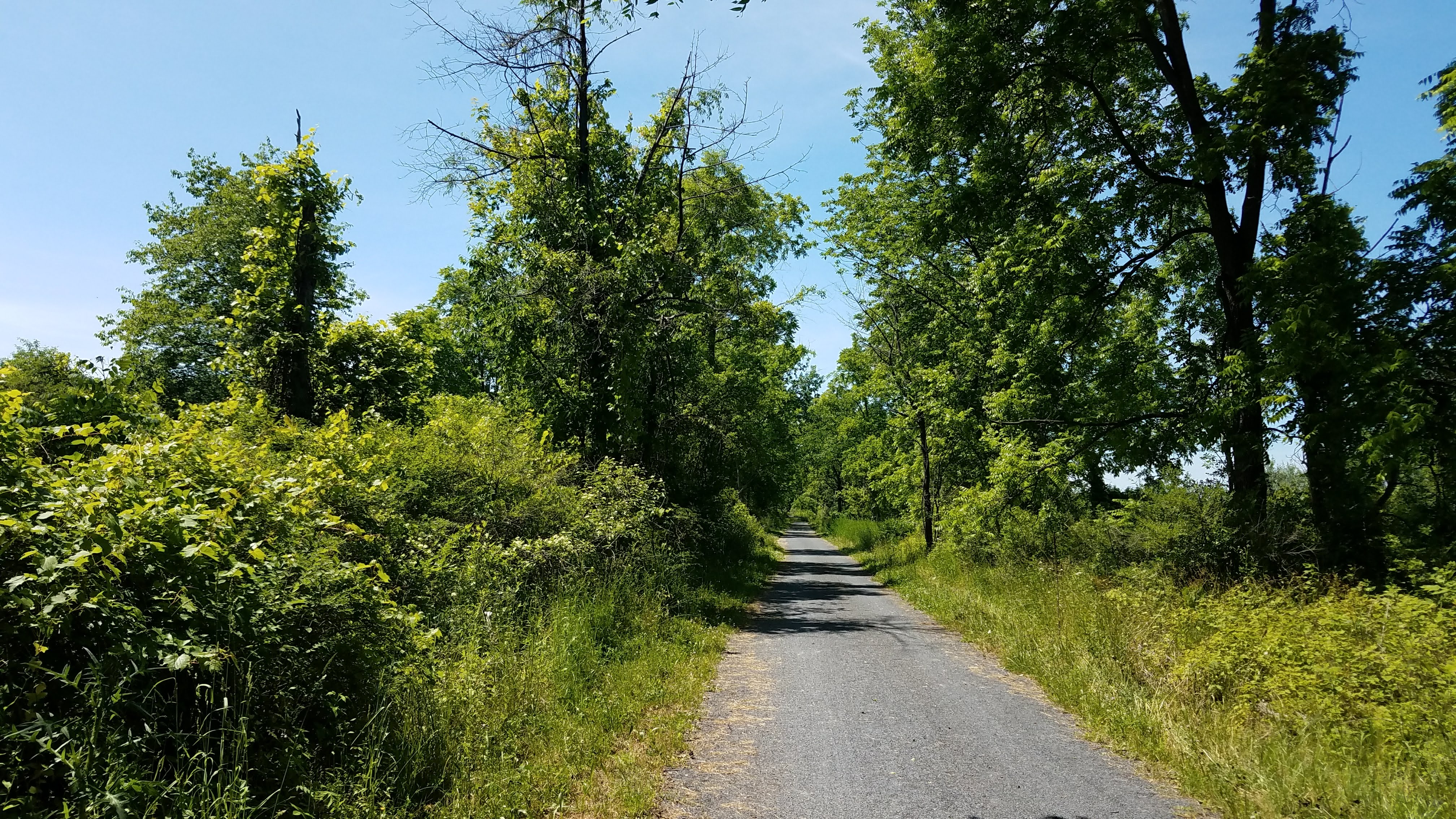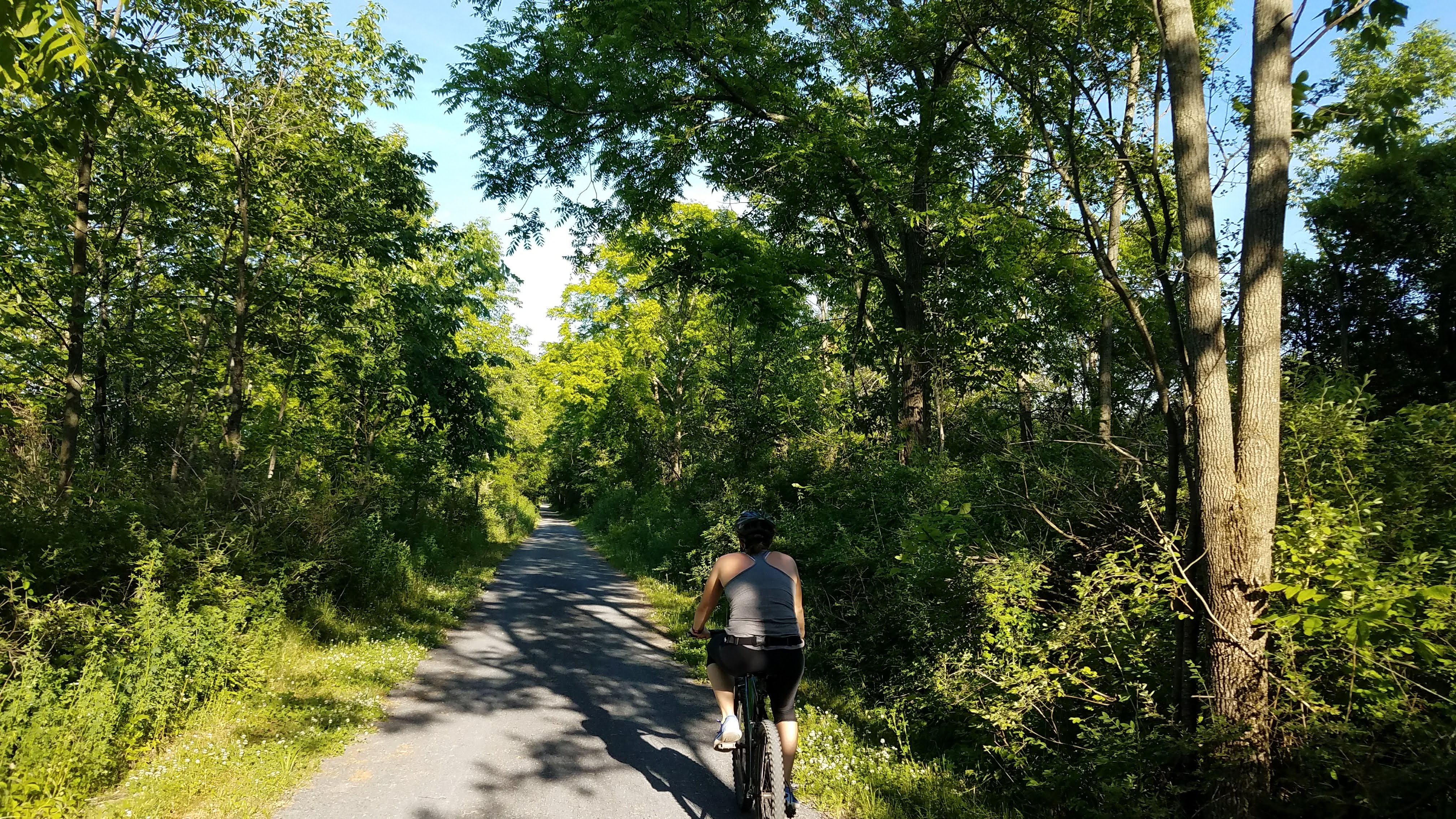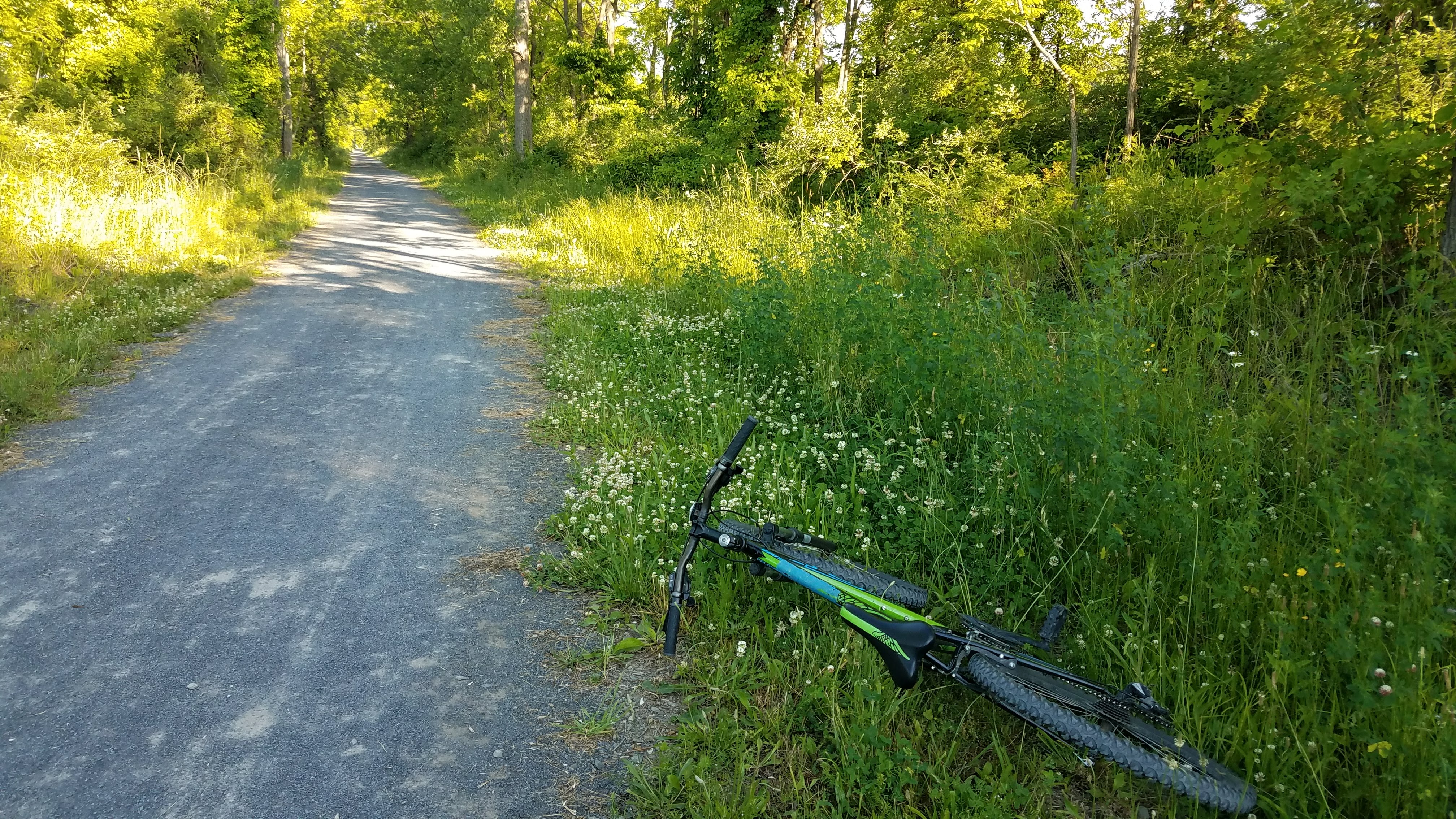 Having been out for at least two hours now, our pale Texas skin was slowly cooking in the ultraviolet-loaded NY air. Pointing our bikes up the trail, we realized that geography dictated this entire ride would be uphill. The promise of fresh, cold (we had no idea what “cold” meant at this point) water to jump into, combined with kayaks and canoes, sounded irresistible and helped on the inclines. As you can see on the map above, the trail was just about arrow straight – a reminder of the April Fool’s Half Marathon in Michigan a few month earlier. That run was 6.5 miles out, 6.5 back on a rails-to-trails track past some of the funkiest smelling chicken huts in the Midwest. This bike ride, while all straight, dirt roads with no hills or curves in the trail, had the benefit of nicer weather and beverages for occasional breaks. Whenever the trail monotony induced boredom, we took a stop for photos. And maybe a sip of a beverage …
