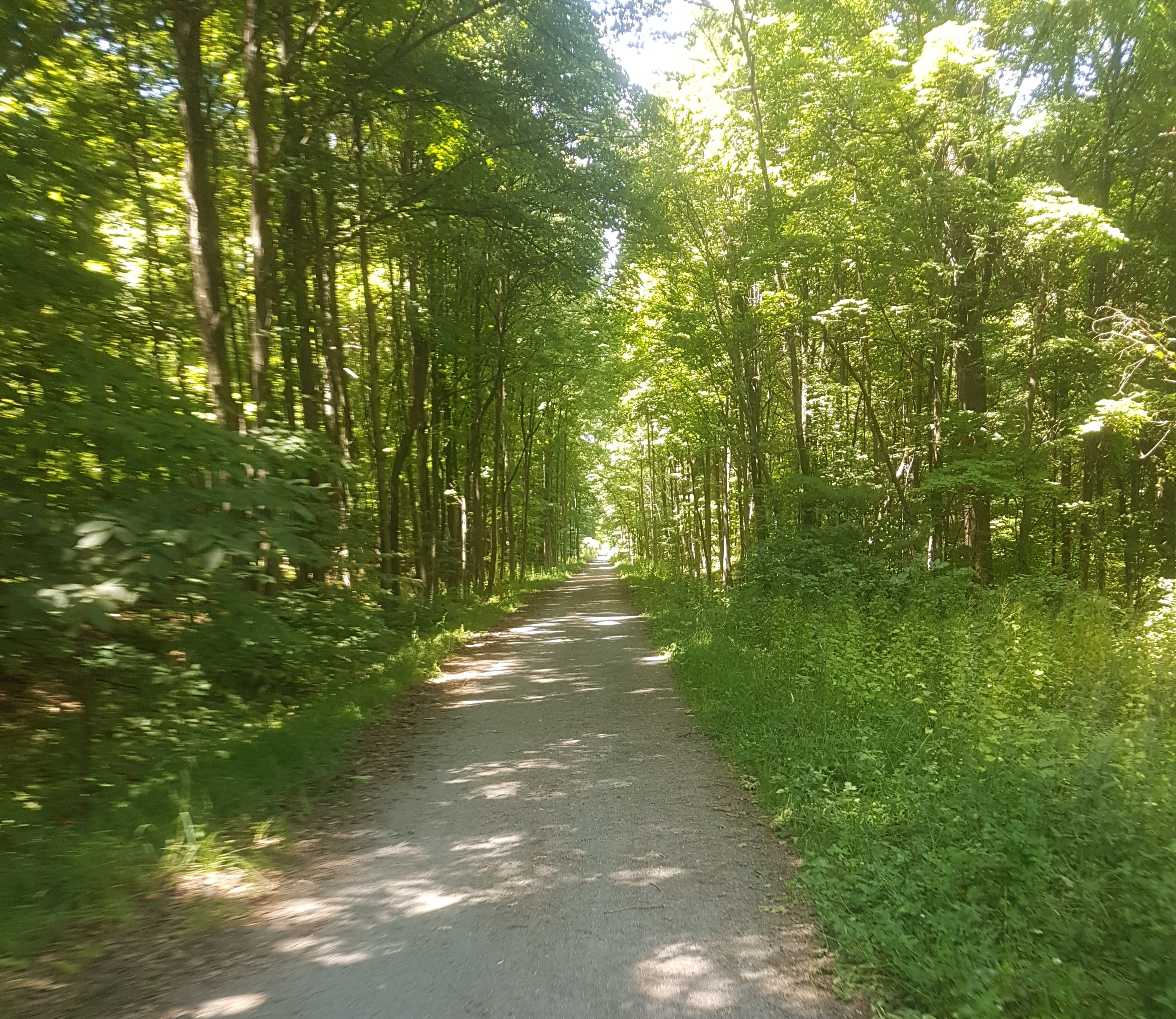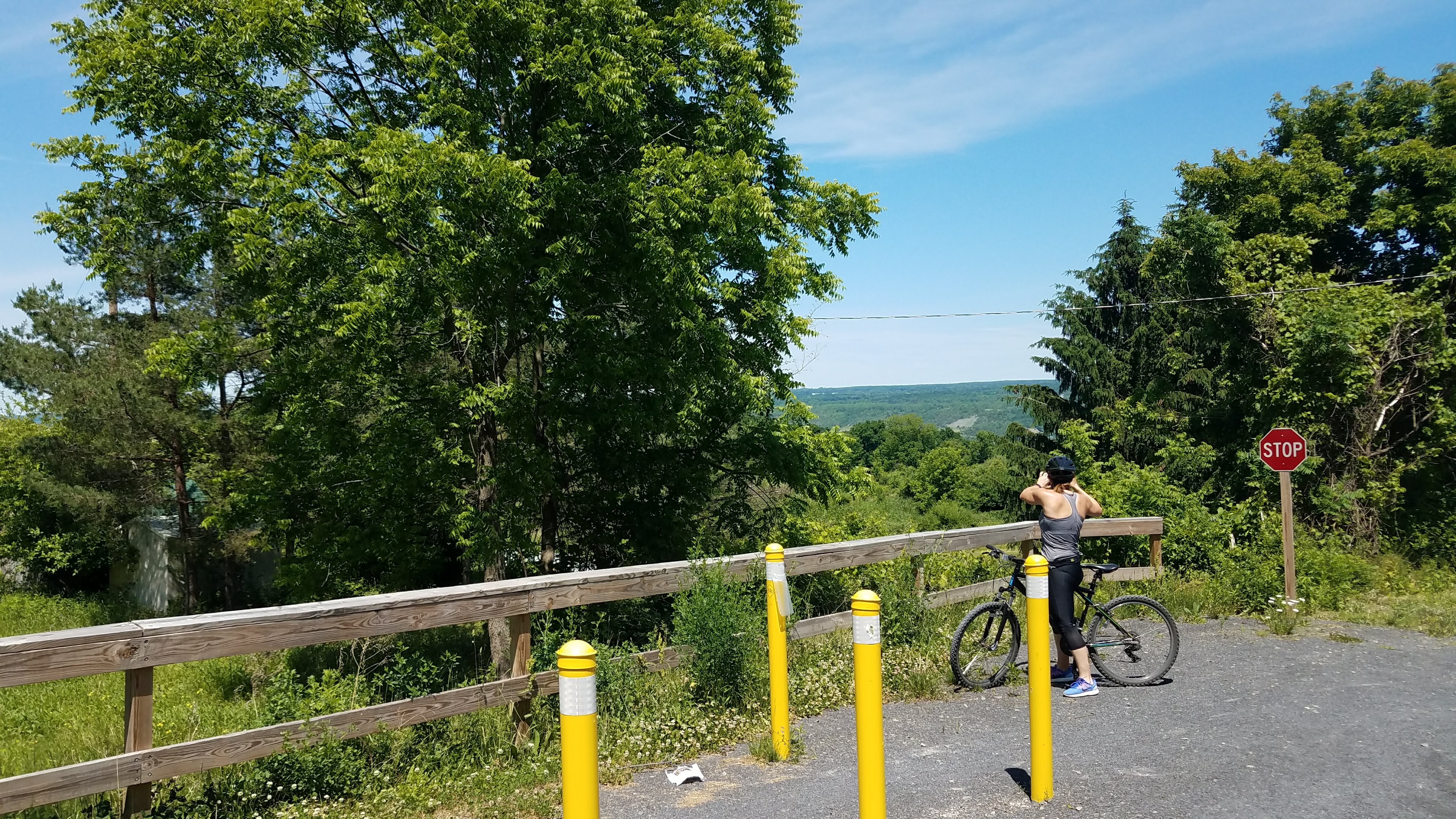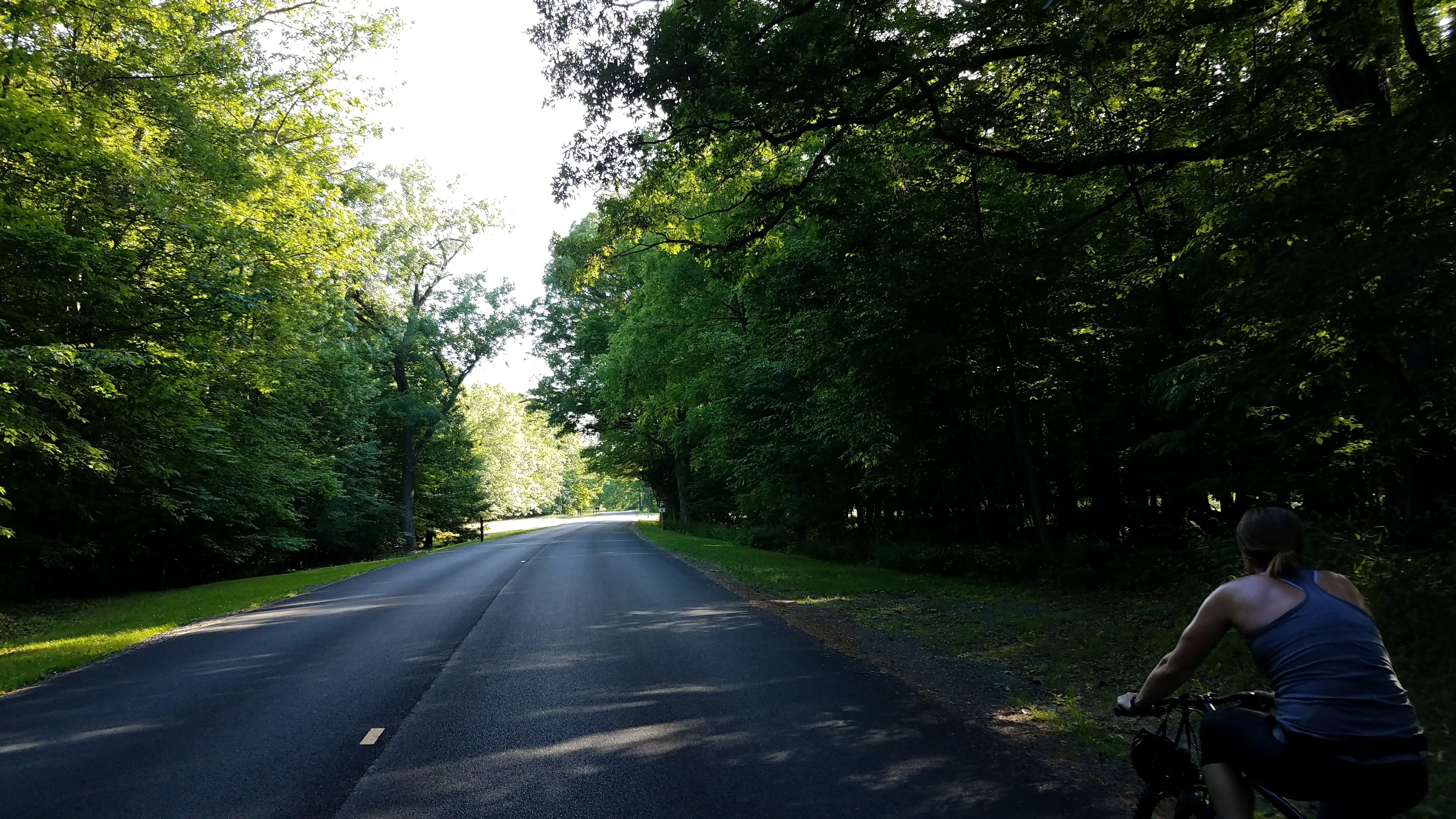 Having been out for at least two hours now, our pale Texas skin was slowly cooking in the ultraviolet-loaded NY air. Pointing our bikes up the trail, we realized that geography dictated this entire ride would be uphill. The promise of fresh, cold (we had no idea what “cold” meant at this point) water to jump into, combined with kayaks and canoes, sounded irresistible and helped on the inclines. As you can see on the map above, the trail was just about arrow straight – a reminder of the April Fool’s Half Marathon in Michigan a few month earlier. That run was 6.5 miles out, 6.5 back on a rails-to-trails track past some of the funkiest smelling chicken huts in the Midwest. This bike ride, while all straight, dirt roads with no hills or curves in the trail, had the benefit of nicer weather and beverages for occasional breaks. Whenever the trail monotony induced boredom, we took a stop for photos. And maybe a sip of a beverage …