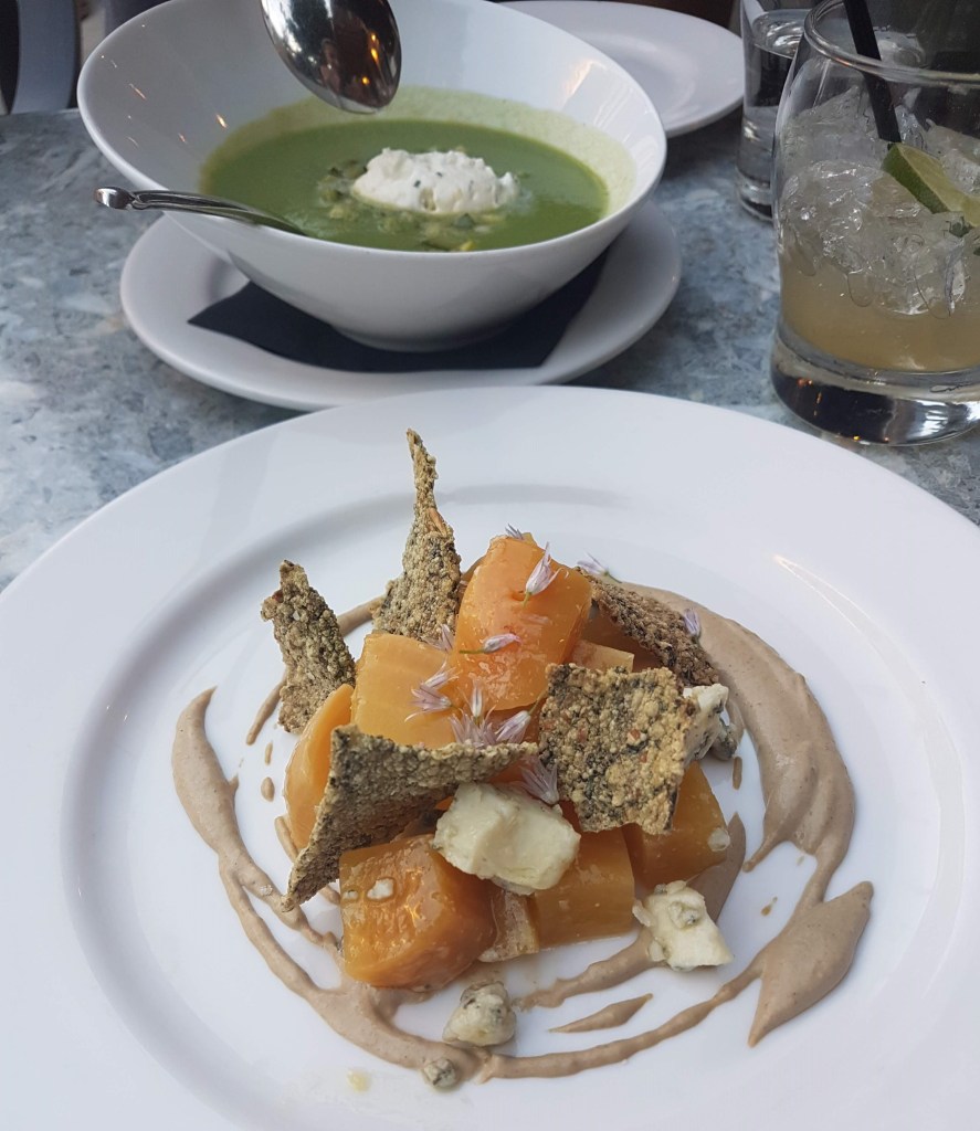 Arriving in downtown, we dropped off our bikes and began the search for sustenance. Rounding the corner, we considered places we’d already visited, but fortunately spotted a patio attached to Simeon’s. Soup and some roasted vegetables with well-crafted beverages, led to great entrees under a calm June evening sky. Turned out to be the perfect patio to observe the Ithacans enjoying their usual Saturday night activities.