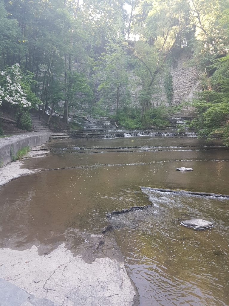Saying goodbye to the crowd of departed in the cemetery, we found our way to the bridge across Fall Creek, offering some pretty dramatic views (not done a lot of justice by phone photos) across the downtown center.