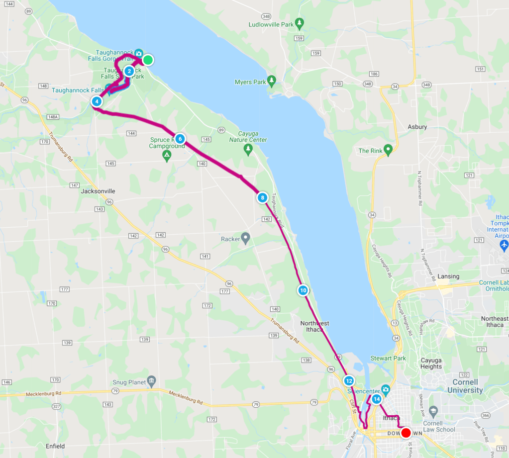 Exercise and recovery complete, we packed our things and dialed a taxi since Uber didn’t appear to be working on Sunday in Ithaca. Fortunately, this driver delivered us directly to the airport without a daylight tour of the city.