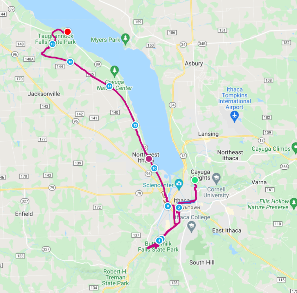 In 2018 we were working on a long-term goal of completing a half marathon in all 50 states. This was an ambitious goal for two average, middle-aged runners, but we had started off well, having already accomplished Texas, Michigan and Nevada by the beginning of the summer. When we booked a trip to Ithaca, we knew this didn’t really fit the mission as we’d already run a half marathon here two years prior. Ithaca is a beautiful little college town tucked into upstate New York on the south end of Cayuga Lake surrounded by trees and well-known for its waterfalls and dramatic gorges.