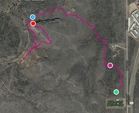 Before leaving Amarillo, we accomplished our daily pre-drive exercise ritual with a quick run at the Wildcat Bluff Nature Center outside the west loop. The land around the nature center is mesquite scrub and some open pasture, liberally dotted with cows and their offspring, but leading to a rocky outcropping overlooking a dry creek with 350 million year old rocks and notes about the cattle drives that passed through here in the 1800’s. A nice diversion and one of the little niches of scenery scattered around the Panhandle as a break from the sometimes endless horizons: