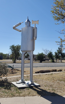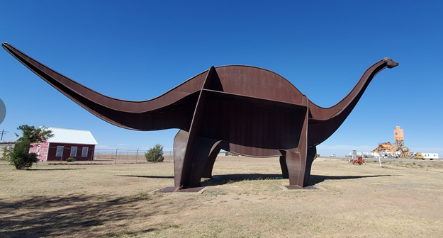 Arriving in Dalhart, and instead of taking 87 to New Mexico, turning on 385 and heading into Oklahoma, we sat for a few long, straight, uneventful hours before we found ourselves in Boise City. One of many high plains towns built on false promises, misleading advertising, and speculation, Boise City is today another windblown grid at the intersection of roads that mostly carry cattle, cotton, and oil to other places. At the edge of town, near an interesting looking local history museum, we were greeted by a life-sized rust-coated steel Apatosaurus statue, along with a refugee from the Wizard of Oz: