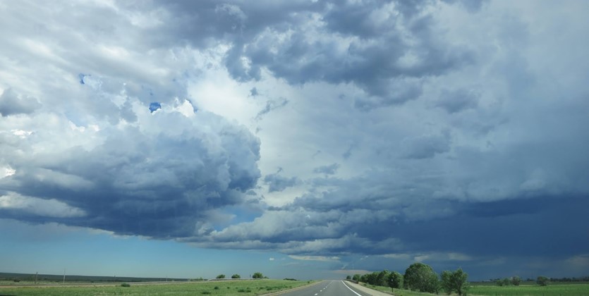 One of the beauties of the high desert near the mountains is the sudden appearance of gully-washing storms. As we headed out of Raton, we enjoyed the sharp temperature drop and dramatic views of some mild storms crossing I-25 – big, rolling clouds and dark skies, zips of lightning and rain curtains washing across the prairies. The smell of high-desert rain is intoxicating.
