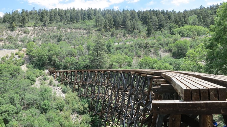 Downtown Cloudcroft is about the same size as my apartment bathroom, but we were able to find a great coffee spot: Black Bear. Crammed into the end of the main street strip of buildings, and making great drinks, it was a nice intro to the town. Burritos at Burro Street across the road were more of an “eh” food – adequate substance to fuel hikers, but not worth going back for. Time for health insurance funding and exercise – Cloudcroft is in the middle of a national forest, with hiking, biking, off-roading, and logging trails everywhere. We found a trail a mile or so away from the little cabin, perched on the edge of town and leading to one of many places marked for exploration – the Trestle Recreation Area – and started walking. Clearing the edge of the national forest grounds, we passed a sign, a gate, and a rebuilt chunk of railroad bridge, followed by a porch-bound salesman trying to attract donations to support the trail maintenance and recreational group who keep the rail bridge and a convenient Airbnb in business. Looking at a driveway that is reputed to have beaten all-wheel drive pickups and sedans with equal prowess, we politely moved on. While the hike was pleasant, both parties admitted that the remaining 1/4 mile of the old Mexican trestle railway bridge was not the most impressive thing we’d seen lately. Someone constructed a few wooden beams in a canyon strong enough to support a train – who can’t do that <cough />? Instead of a straight out and back, we decided to check out the other trails in the area, racking up about 2.5 miles, with views that are hard to discern from an aerial Google Maps photo. The edges of the White Sands National Monument and some far off peaks were visible down the valley to the west, but with the sun climbing and high, dry forest air baking us, we were glad to see the end of the trail.