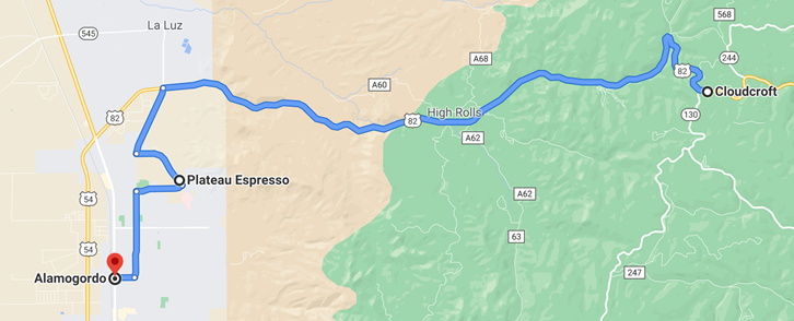 After acquiring photographic evidence that Orogrande exists, we headed toward Cloudcroft. Aside from reminders of the increasingly militarized southern edge of our country in the form of yet another Border Patrol checkpoint, we were back to the plan. Google said to go all the way around through Alamogordo to get to Cloudcroft, but we spotted road #506 that seemed like a scenic shortcut across to the southern edge of Lincoln National Forest. This was a great plan on the phone, saving us multiple miles of driving. Unfortunately the polite Google voice didn’t inform us that CR 506 (like many other roads in this area) crosses the US government’s live firing ranges and is therefore considered slightly hazardous for Hyundai Konas and their operators. With our shortcut blocked by the need to blow cactus and coyotes to hell, we were met at the entrance to 506 with a CLOSED sign.