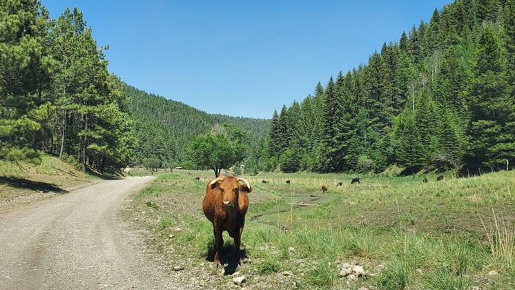 Avoiding direct routes as usual, we aimed for the Bluff Springs National Recreation area, and exiting the main road, headed down the river valley. While the road to Weed wasn’t paved, the new all wheel drive Kona was more than capable of handling a moderately rough ranch road. We bounced our way through the National Forest, winding up at a pull-out with a trail and falls fed by the eponymous Bluff Springs. Crystal clear water from the springs was unfortunately occupied by human feet during our visit, but the cattle grazing nearby and the beauty and isolation of the valley were a nice break.