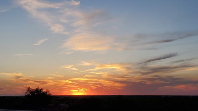 Carlsbad was next, where a search for “gastropub” led us to dinner at the Yellow Brix Restaurant. Now this was inspiring. A surprisingly excellent menu, with several healthy options, and great environment in an old remodeled home. Crowd-watching in southern New Mexico was fun, and the meal was a nice change of pace. Bellies full, we stopped for one last walk, then headed west out of Carlsbad toward Hobbs, watching for sunset in the rearview mirror. Stopping at one of many abandoned buildings along the highway, we managed to grab photographic evidence through the petrochemical haze that appears to be blanketing this part of the country now.