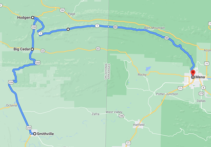 A gorgeous trip along an ancient moutain ridge, this road is well worth the time it takes to drive. Winding through a large forest area with significant elevation changes and beautiful views, there are trailheads, turnouts, and other features all along the highway. We stopped a few times to check them out, and reminded ourselves of the yearly bicycle ride that runs up and down this – a future trip. Impending darkness and hunger caused us to skip the last few scenic points, and we made our way down to Mena for dinner.