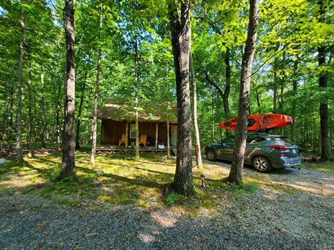 Abandoning the concept of an early morning run, we still made it out of bed before too late. The cabin was a little more visible in the morning, with a nice (bug-covered) porch, and near silence outside despite only being a mile or so from the busiest road in the area: