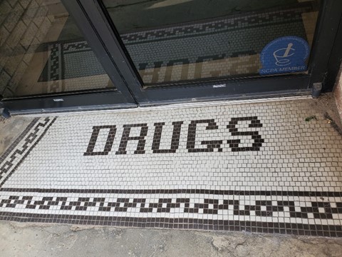 All this consumption of course created post-meal exhaustion, and we fought through that as we headed back to the cabin to clean up. It was the perfect time for a nap, but exploration called and we didn’t want to waste any daylight. We unfortunately also had an issue with some poison ivy from earlier in the week which needed attention. Changing clothes and packing up some road stuff, we headed to the nearest town, Marshall, to pick up a prescription for the quickly spreading rash (Tel-A-Doc online is miraculous when you’re 450 miles from home). We were lucky to find a local pharmacy still open late on Thursday afternoon, and more than willing to accommodate a last minute request for medication. Their tile entryway was appropriately labeled.