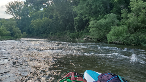 Acquired about a year ago, it has seen plenty of time in the water – the navigator is fairly skilled in keeping the board right side up. It’s an inflatable, so pumping it up to the required 15 psi, when it’s 90 degrees and 85% humidity, (or when it’s 60 degrees and dry for that matter) isn’t much fun, but once it’s on the water it’s solid and reliable. Inflated and with both vessels loaded up with shoes, life jackets, water bottles, phones in waterproof bags, hats, and miscellaneous towels and snacks, we hopped into the river. One paddleboard, one kayak.