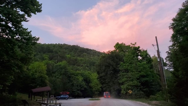We couldn’t stay in Yellville forever, so after dinner, we picked a new route back to the cabin. This would take us around the other side of river toward the cabin, with a goal of finding a spot to watch the sunset. Checking Google while heading south on 14 we realized we weren’t too far from one of the several thousand places marked “to visit”. Given this recent obsession with ghost towns, I’m not sure how I didn’t realize we were so close to Rush Historic District until we were a few miles away. Without a fixed schedule, of course, we impulsively took this detour. In addition to knocking out a ghost town, we could check out the river access at Rush Landing for future boat launches. Turning left, we watched the sun quickly dropping while we wandered down the dirt trail toward Rush. We made it down to the river, avoiding emergency vehicles which appeared to be preparing for a water rescue, although we never could determine if there was actually an emergency. At the river, we stopped to chat with a park ranger, who was casually eating a snack outside his truck; he greeted us and commented on the weather. Maybe there wasn’t a person in danger, we thought, but then passed an ambulance and another park ranger with a rescue boat headed down to the river area.