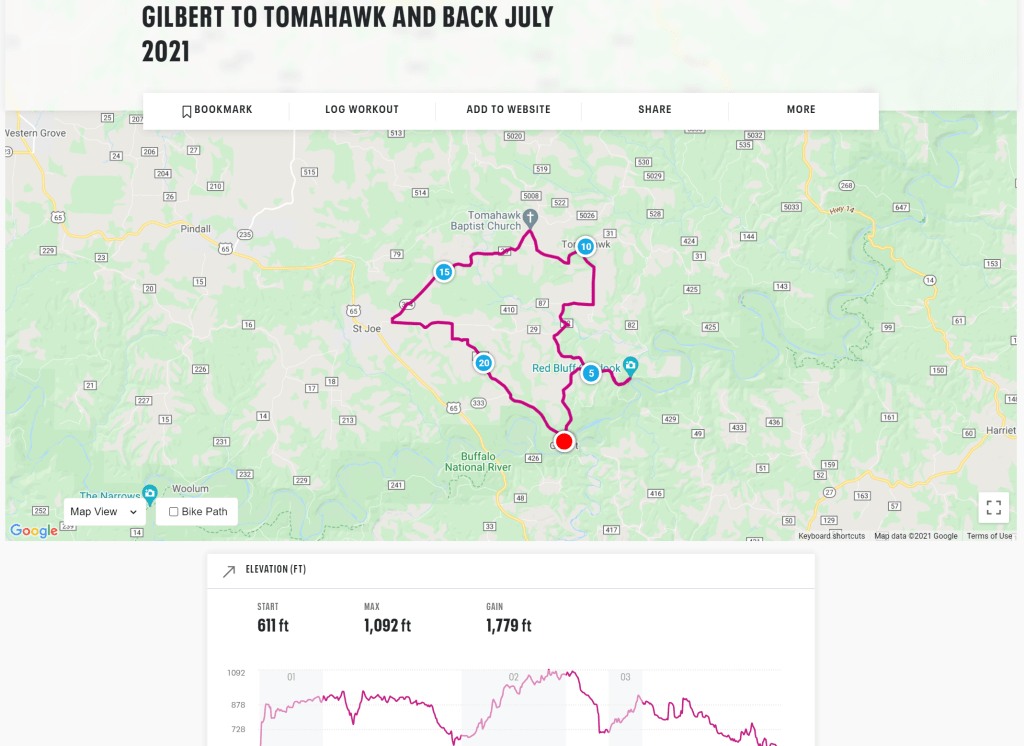 Gilbert is down in the river valley, at a very low elevation, so any exit requires significant climbing. In a car or rattly canoe delivery van, that’s stomping on the accelerator. On a bicycle, that’s leg power. You’ll note that both of the routes start with a stiff climb, meaning within five minutes of starting the ride, our jerseys were saturated and we were well in to zone 4 in the land of effort. Once we cleared that first hill, navigating our way down the dirt roads of Arkansas was a scenic and fun change of pace.